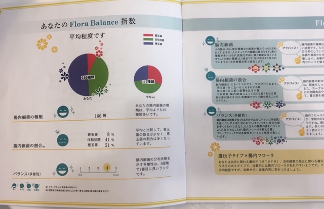 フローラチェック→Flora Balance(腸内細菌の種類、善玉菌、悪玉菌、日和見菌のバランス) ,Shape(太る菌、やせる菌のバランス),Happy(しあわせホルモン)