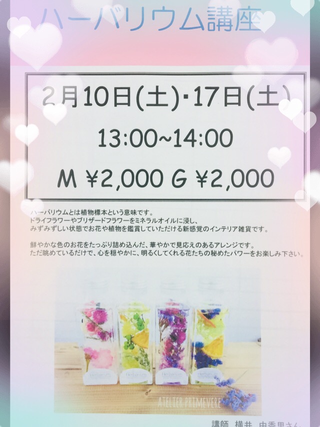 2月はあらたに『ハーバリウム作り』の講座を2/10 と 2/17 の2回開催します♪