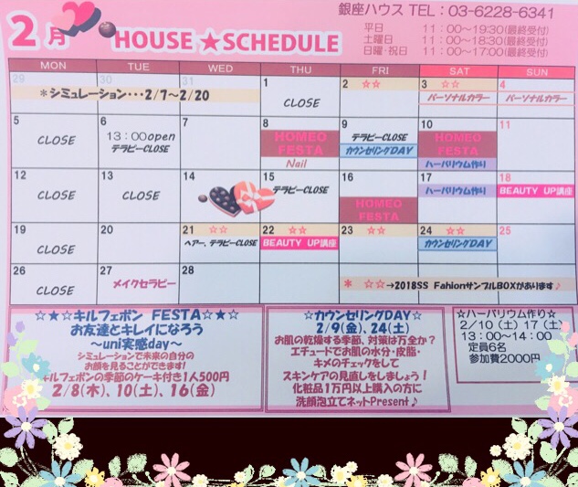 銀座ハウスの2月のスケジュールです(๑>◡<๑)