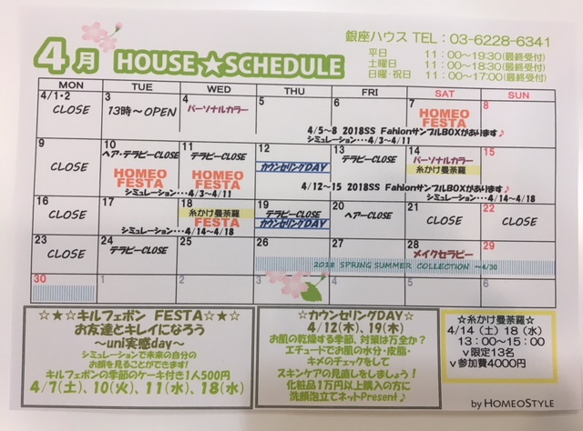 HOMEO BLOGホメオスタイルのブログ ハウスブログ 銀座 2018.3.30 銀座 ☆銀座ハウス☆ 4月スケジュール 銀座ハウスの4月のスケジュールです♪♪♪ 4月は定休日の月曜日のほかに、4/21(土) 22(日)も京都での研修の為ハウスクローズになります。 3月も明日で終わり・・・ 4月も沢山の皆様の来店をスタッフ一同お待ちしています!! Share Post: カテゴリー コラム 一覧 計量スプーンも包丁もいらない♪ 超カンタン&おいしい元気回復系スムージー アリーのHOMEO LIFE~私のお腹の中を覗いてみる。~ 「夏のスキンケア」 カラダがほしがる水 大人の夏肌は(๑•̀ㅂ•́)و✧ 細胞力をUPしましょう☆彡 今年の夏旅におすすめ ハウスブログ 一覧 6月のスケジュールです✨️ eコンクファンタスティック2023✨️ マルチオイル美容液💧 新城ハウスです🎏 5月のスケジュール🎏 米沢ハウス☘️5月スケジュール 下書き東北仙台伊達福島山形米沢関東横浜銀座新宿土浦大宮東海浜松浜北豊橋新城田原湖西名古屋岡崎西尾吉良信越・北陸長野北長野千曲松本上田佐久中野上越あらい関西大阪京都奈良吉野中国倉敷岡山福山 最近の投稿 6月のスケジュールです✨️ 2023.5.31 eコンクファンタスティック2023✨️ 2023.5.18 マルチオイル美容液💧 2023.5.8 新城ハウスです🎏 2023.5.7 5月のスケジュール🎏 2023.5.2 人気の投稿 睡眠の質を上げて細胞が喜ぶ 34 views β2AR遺伝子 16 views <地域限定コラボ> 地域の皆様だけのお得な話♪【 Vol.8仙台 】 14 views 洋服の歴史 11 views 当たったよ~!☆ 6 views 『四季島』 行ってきました! 6 views #ぴよりんチャレンジ☆ 5 views 有名人! 5 views ☆山梨銘菓 かねたまる餅☆ 5 views 西尾名物!抹茶の大福☆ 5 views アーカイブ 2023 6月のスケジュールです✨️ eコンクファンタスティック2023✨️ マルチオイル美容液💧 新城ハウスです🎏 5月のスケジュール🎏 2022 皆様をお出迎え(^^♪ 今年もありがとうございました。 1月のスケジュール🎍 1月のスケジュール 佐久1月 スケジュ-ル 2021 2021年ありがとうございました ありがとうございました✨ 本年もありがとうございました🍀 年末好例!!お餅つき 大阪ハウスより感謝の気持ちを込めて・・・💛 2020 2020年もありがとうございました☆ 2021年もよろしくお願い致します🐄 予告!21年2月に腸内フローラチェックが受けられます。 嬉しいお声! ホメオスタイル大宮1月スケジュール 2019 1月のスケジュール 年末年始に菌活🎶 大晦日 ありがとうございました。 大晦日♪ 2018 2018年も、ありがとうございました。 奈良ハウスの門松 2018年ありがとうございました ~2019:1月スケジュール~ 1月スケジュール 2017 2017年良いお年を✨岡山ハウス ハーバリウム♪ 有馬温泉 冬の御堂筋 ありがとうございました😊❤ 2016 今年も一年ありがとうございました⭐️ 大晦日 長野ハウス★今年も一年ありがとうございました! 12月30日(金) 仙台ハウスより 美活のための年末大掃除