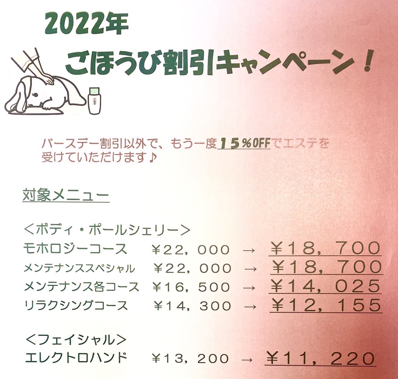 お誕生日月のBirthday割引(30%OFF)以外になんとエステを15%OFFで受けれちゃう、銀座ハウスのエステだけのキャンペーン、それがごほうび割引です💙