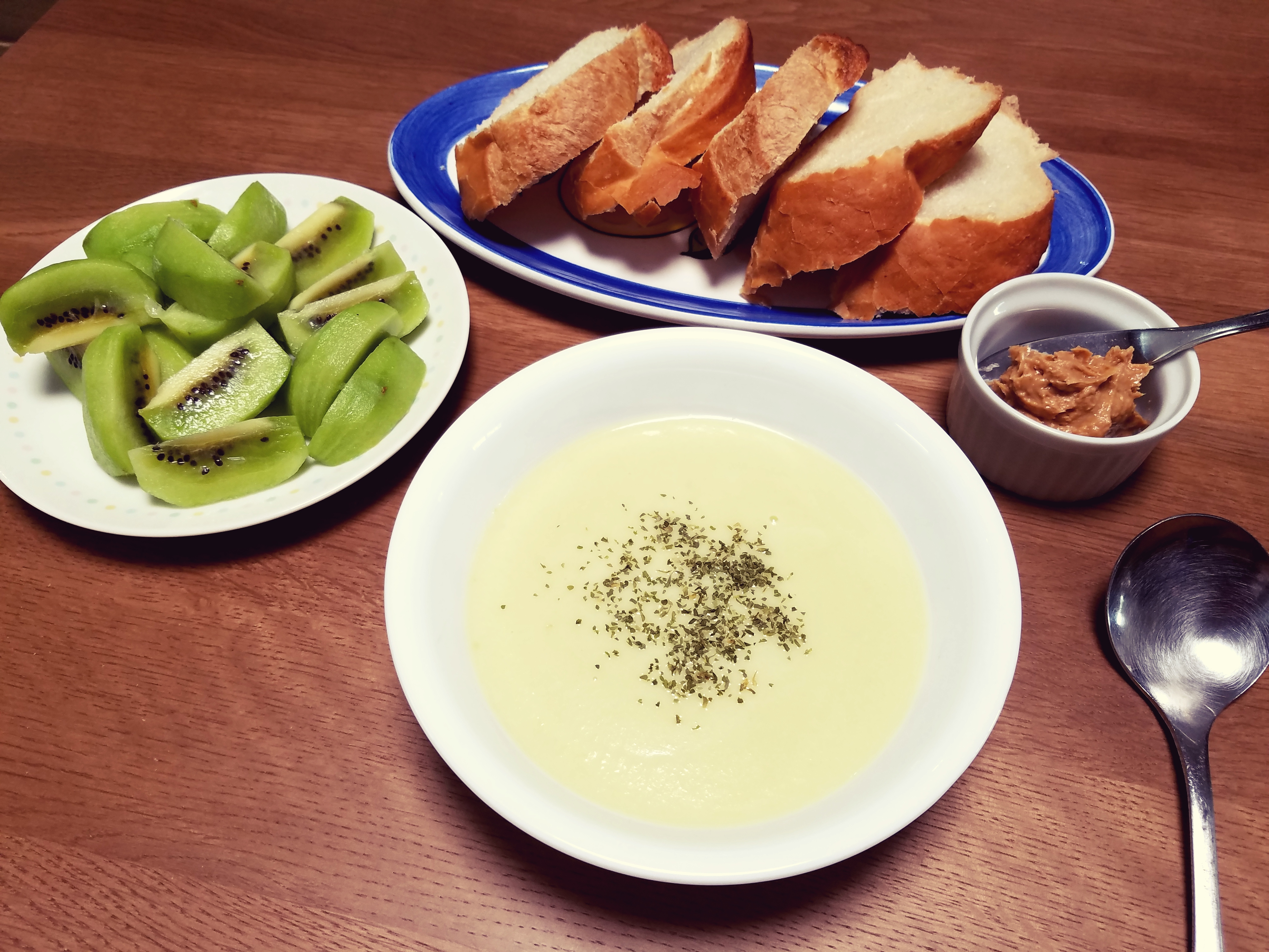 今日は、スープにパセリをちらし、レバーペーストとキウイをプラスして、紫外線対策強化メニューにしてみました。