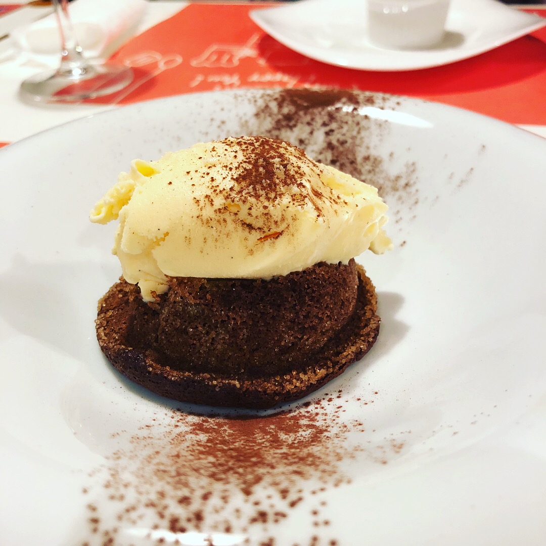 焼きたてのチョコレートケーキにアイスクリームがのっています。