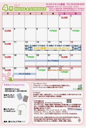 HOMEO BLOGホメオスタイルのブログ ハウスブログ 銀座 2023.3.31 銀座 銀座ハウス4月スケジュール 今日は、暖かいですね。 お花見日和です。 銀座ハウス近くの桜も綺麗です。 4月のスケジュールです。 お肌の数値を測定する日や、 お友達をフェイシャル体験にご招待するペアデイ、 ファッション等、ございますので、是非、お越し下さい❣ Share Post: カテゴリー コラム 一覧 計量スプーンも包丁もいらない♪ 超カンタン&おいしい元気回復系スムージー アリーのHOMEO LIFE~私のお腹の中を覗いてみる。~ 「夏のスキンケア」 カラダがほしがる水 大人の夏肌は(๑•̀ㅂ•́)و✧ 細胞力をUPしましょう☆彡 今年の夏旅におすすめ ハウスブログ 一覧 6月のスケジュールです✨️ eコンクファンタスティック2023✨️ マルチオイル美容液💧 新城ハウスです🎏 5月のスケジュール🎏 米沢ハウス☘️5月スケジュール 下書き東北仙台伊達福島山形米沢関東横浜銀座新宿土浦大宮東海浜松浜北豊橋新城田原湖西名古屋岡崎西尾吉良信越・北陸長野北長野千曲松本上田佐久中野上越あらい関西大阪京都奈良吉野中国倉敷岡山福山 最近の投稿 6月のスケジュールです✨️ 2023.5.31 eコンクファンタスティック2023✨️ 2023.5.18 マルチオイル美容液💧 2023.5.8 新城ハウスです🎏 2023.5.7 5月のスケジュール🎏 2023.5.2 人気の投稿 洋服の歴史 18 views ヨガ 12 views #ぴよりんチャレンジ☆ 10 views <地域限定コラボ> 地域の皆様だけのお得な話♪【 Vol.8仙台 】 10 views 米沢上杉まつり🌸「民謡流し」👯 10 views 2020ミスジャパン☆応援お願いします 7 views β2AR遺伝子 7 views ☆銀座ハウス☆ ヒルナンデスに出ます!! 6 views ジュエリーフェア開催中 6 views トヨハシサンダーズ⚡️ 5 views アーカイブ 2023 6月のスケジュールです✨️ eコンクファンタスティック2023✨️ マルチオイル美容液💧 新城ハウスです🎏 5月のスケジュール🎏 2022 皆様をお出迎え(^^♪ 今年もありがとうございました。 1月のスケジュール🎍 1月のスケジュール 佐久1月 スケジュ-ル 2021 2021年ありがとうございました ありがとうございました✨ 本年もありがとうございました🍀 年末好例!!お餅つき 大阪ハウスより感謝の気持ちを込めて・・・💛 2020 2020年もありがとうございました☆ 2021年もよろしくお願い致します🐄 予告!21年2月に腸内フローラチェックが受けられます。 嬉しいお声! ホメオスタイル大宮1月スケジュール 2019 1月のスケジュール 年末年始に菌活🎶 大晦日 ありがとうございました。 大晦日♪ 2018 2018年も、ありがとうございました。 奈良ハウスの門松 2018年ありがとうございました ~2019:1月スケジュール~ 1月スケジュール 2017 2017年良いお年を✨岡山ハウス ハーバリウム♪ 有馬温泉 冬の御堂筋 ありがとうございました😊❤ 2016 今年も一年ありがとうございました⭐️ 大晦日 長野ハウス★今年も一年ありがとうございました! 12月30日(金) 仙台ハウスより 美活のための年末大掃除