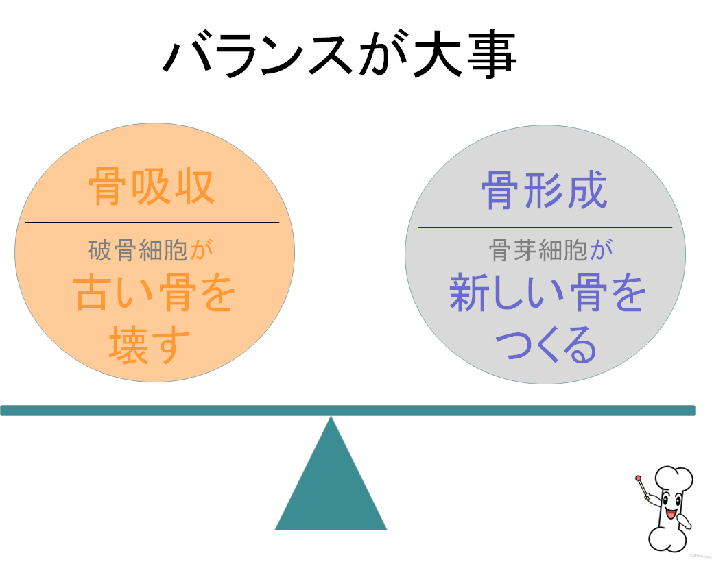 骨を壊す破骨細胞と骨を作る骨芽細胞は、常に壊して作るを繰り返し新陳代謝しています。