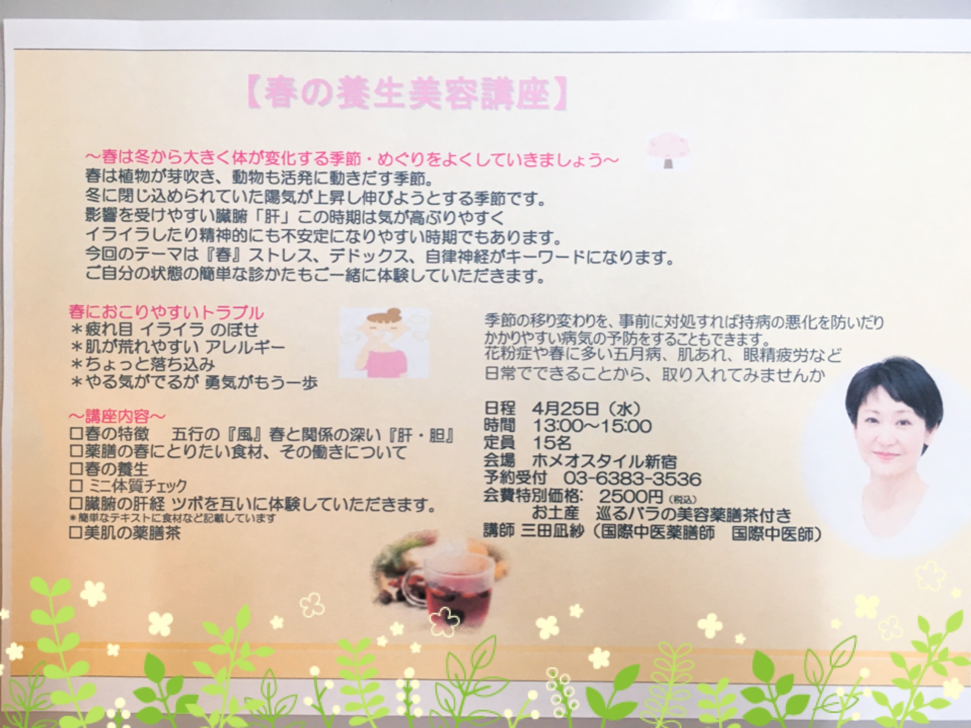 HOMEO BLOGホメオスタイルのブログ ハウスブログ 新宿 2018.4.6 新宿 🌷春の養生美容講座🌷 今月25日(水) 13:00〜15:00 ホメオスタイル新宿で 待望の 🌿春の養生美容講座🌿 開催いたします🌼 講師は、国際中医薬膳師 国際中医師の三田凪紗さんです♡ 春におこりやすいトラブルについて 今この時期に食べたい食材や、美肌の秘訣 身体のツボなど、とてもわかりやすく教えていた だけます♡ 会費2,500円🌸 定員15名🌷 ご予約は新宿ハウスまでお気軽にお問い合わせください♡ Share Post: カテゴリー コラム 一覧 計量スプーンも包丁もいらない♪ 超カンタン&おいしい元気回復系スムージー アリーのHOMEO LIFE~私のお腹の中を覗いてみる。~ 「夏のスキンケア」 カラダがほしがる水 大人の夏肌は(๑•̀ㅂ•́)و✧ 細胞力をUPしましょう☆彡 今年の夏旅におすすめ ハウスブログ 一覧 6月のスケジュールです✨️ eコンクファンタスティック2023✨️ マルチオイル美容液💧 新城ハウスです🎏 5月のスケジュール🎏 米沢ハウス☘️5月スケジュール 下書き東北仙台伊達福島山形米沢関東横浜銀座新宿土浦大宮東海浜松浜北豊橋新城田原湖西名古屋岡崎西尾吉良信越・北陸長野北長野千曲松本上田佐久中野上越あらい関西大阪京都奈良吉野中国倉敷岡山福山 最近の投稿 6月のスケジュールです✨️ 2023.5.31 eコンクファンタスティック2023✨️ 2023.5.18 マルチオイル美容液💧 2023.5.8 新城ハウスです🎏 2023.5.7 5月のスケジュール🎏 2023.5.2 人気の投稿 洋服の歴史 18 views ヨガ 13 views 米沢上杉まつり🌸「民謡流し」👯 11 views #ぴよりんチャレンジ☆ 10 views <地域限定コラボ> 地域の皆様だけのお得な話♪【 Vol.8仙台 】 10 views 2020ミスジャパン☆応援お願いします 7 views β2AR遺伝子 7 views ☆銀座ハウス☆ ヒルナンデスに出ます!! 6 views ジュエリーフェア開催中 6 views トヨハシサンダーズ⚡️ 5 views アーカイブ 2023 6月のスケジュールです✨️ eコンクファンタスティック2023✨️ マルチオイル美容液💧 新城ハウスです🎏 5月のスケジュール🎏 2022 皆様をお出迎え(^^♪ 今年もありがとうございました。 1月のスケジュール🎍 1月のスケジュール 佐久1月 スケジュ-ル 2021 2021年ありがとうございました ありがとうございました✨ 本年もありがとうございました🍀 年末好例!!お餅つき 大阪ハウスより感謝の気持ちを込めて・・・💛 2020 2020年もありがとうございました☆ 2021年もよろしくお願い致します🐄 予告!21年2月に腸内フローラチェックが受けられます。 嬉しいお声! ホメオスタイル大宮1月スケジュール 2019 1月のスケジュール 年末年始に菌活🎶 大晦日 ありがとうございました。 大晦日♪ 2018 2018年も、ありがとうございました。 奈良ハウスの門松 2018年ありがとうございました ~2019:1月スケジュール~ 1月スケジュール 2017 2017年良いお年を✨岡山ハウス ハーバリウム♪ 有馬温泉 冬の御堂筋 ありがとうございました😊❤ 2016 今年も一年ありがとうございました⭐️ 大晦日 長野ハウス★今年も一年ありがとうございました! 12月30日(金) 仙台ハウスより 美活のための年末大掃除