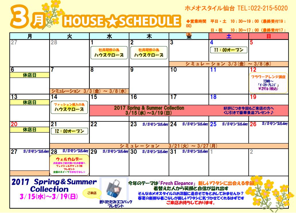HOMEO BLOGホメオスタイルのブログ ハウスブログ 仙台 2017.2.27 仙台 2月27日㈪ 仙台ハウスより 3月のスケジュールです😄 3月15日㈬~19日㈰は 2017 Spring & Summer Collectionが開催されます。 」 今年のテーマは 「Fresh Elegance」 新しいワタシに出会える季節🌸 着替えた人から笑顔と自信が溢れ出すファッションです👗 そんなホメオスタイルのお洋服に是非そでを通してみませんか? 春夏の新鮮な着こなしが新しいワタシに気づかせてくれるはずです。 ご来店お待ちしております✨ Share Post: カテゴリー コラム 一覧 計量スプーンも包丁もいらない♪ 超カンタン&おいしい元気回復系スムージー アリーのHOMEO LIFE~私のお腹の中を覗いてみる。~ 「夏のスキンケア」 カラダがほしがる水 大人の夏肌は(๑•̀ㅂ•́)و✧ 細胞力をUPしましょう☆彡 今年の夏旅におすすめ ハウスブログ 一覧 6月のスケジュールです✨️ eコンクファンタスティック2023✨️ マルチオイル美容液💧 新城ハウスです🎏 5月のスケジュール🎏 米沢ハウス☘️5月スケジュール 下書き東北仙台伊達福島山形米沢関東横浜銀座新宿土浦大宮東海浜松浜北豊橋新城田原湖西名古屋岡崎西尾吉良信越・北陸長野北長野千曲松本上田佐久中野上越あらい関西大阪京都奈良吉野中国倉敷岡山福山 最近の投稿 6月のスケジュールです✨️ 2023.5.31 eコンクファンタスティック2023✨️ 2023.5.18 マルチオイル美容液💧 2023.5.8 新城ハウスです🎏 2023.5.7 5月のスケジュール🎏 2023.5.2 人気の投稿 洋服の歴史 21 views <地域限定コラボ> 地域の皆様だけのお得な話♪【 Vol.8仙台 】 13 views 2020ミスジャパン☆応援お願いします 13 views #ぴよりんチャレンジ☆ 12 views ヨガ 12 views ☆山梨銘菓 かねたまる餅☆ 11 views 米沢上杉まつり🌸「民謡流し」👯 10 views β2AR遺伝子 8 views ☆銀座ハウス☆ ヒルナンデスに出ます!! 7 views ジュエリーフェア開催中 6 views アーカイブ 2023 6月のスケジュールです✨️ eコンクファンタスティック2023✨️ マルチオイル美容液💧 新城ハウスです🎏 5月のスケジュール🎏 2022 皆様をお出迎え(^^♪ 今年もありがとうございました。 1月のスケジュール🎍 1月のスケジュール 佐久1月 スケジュ-ル 2021 2021年ありがとうございました ありがとうございました✨ 本年もありがとうございました🍀 年末好例!!お餅つき 大阪ハウスより感謝の気持ちを込めて・・・💛 2020 2020年もありがとうございました☆ 2021年もよろしくお願い致します🐄 予告!21年2月に腸内フローラチェックが受けられます。 嬉しいお声! ホメオスタイル大宮1月スケジュール 2019 1月のスケジュール 年末年始に菌活🎶 大晦日 ありがとうございました。 大晦日♪ 2018 2018年も、ありがとうございました。 奈良ハウスの門松 2018年ありがとうございました ~2019:1月スケジュール~ 1月スケジュール 2017 2017年良いお年を✨岡山ハウス ハーバリウム♪ 有馬温泉 冬の御堂筋 ありがとうございました😊❤ 2016 今年も一年ありがとうございました⭐️ 大晦日 長野ハウス★今年も一年ありがとうございました! 12月30日(金) 仙台ハウスより 美活のための年末大掃除