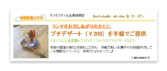 カフェ「ah-shu」でランチをするとプチデザートが半額になる “スペシャルクーポン”を差しあげています♪◝(⁰▿⁰)◜♥