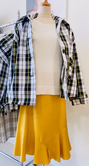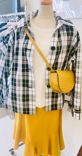 タータンチェックブルゾン、リネンルックスカート、イエローのクラッチBag