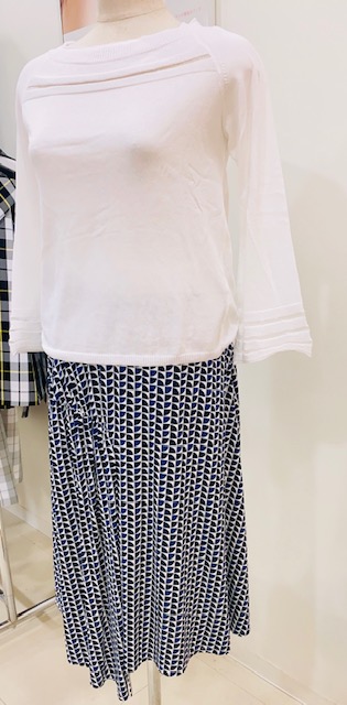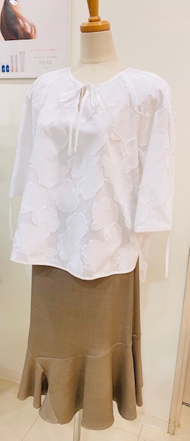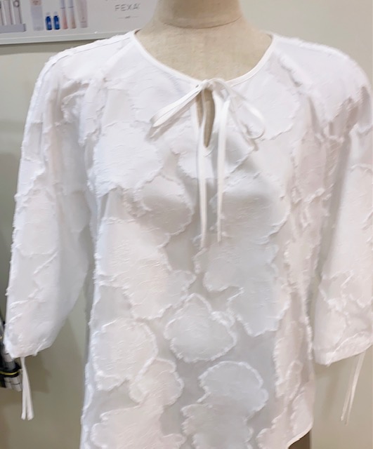 カットボイルブラウス・・・コットンの平織りに柄紋を織り込んだカットボイル素材 柄がさりげないwhiteはなんにでも合わせやすいTOPSです。前後段違い裾ラインがオシャレ😊