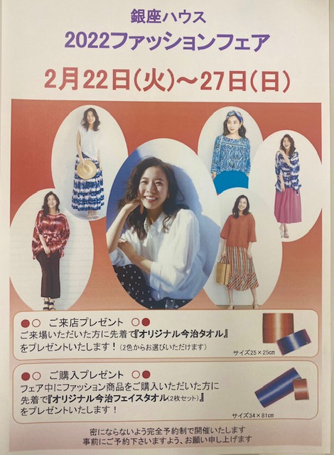 ご予約の上、ファッションフェアに来場いただいた方に先着で『オリジナル今治ハンドタオル』をプレゼントします。肌触り抜群💖(数に限りがあるのでお早めに)