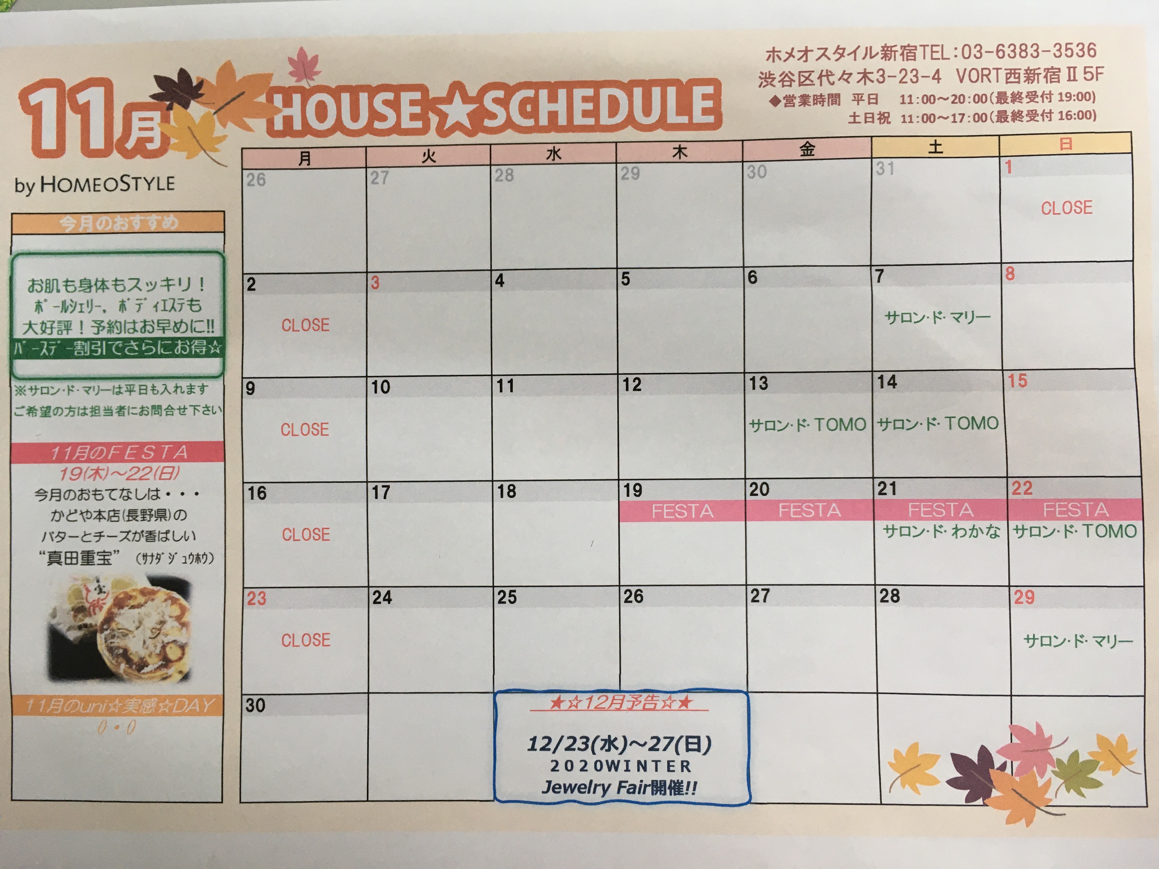 HOMEO BLOGホメオスタイルのブログ ハウスブログ 新宿 2020.10.30 新宿 ✨新宿ハウス11月スケジュール✨ 新宿ハウス11月のスケジュールです✨グッと冷え込んできてます。免疫力アップもかねてぜひハウスご来店くださいませ。お待ちしております😊 Share Post: カテゴリー コラム 一覧 計量スプーンも包丁もいらない♪ 超カンタン&おいしい元気回復系スムージー アリーのHOMEO LIFE~私のお腹の中を覗いてみる。~ 「夏のスキンケア」 カラダがほしがる水 大人の夏肌は(๑•̀ㅂ•́)و✧ 細胞力をUPしましょう☆彡 今年の夏旅におすすめ ハウスブログ 一覧 6月のスケジュールです✨️ eコンクファンタスティック2023✨️ マルチオイル美容液💧 新城ハウスです🎏 5月のスケジュール🎏 米沢ハウス☘️5月スケジュール 下書き東北仙台伊達福島山形米沢関東横浜銀座新宿土浦大宮東海浜松浜北豊橋新城田原湖西名古屋岡崎西尾吉良信越・北陸長野北長野千曲松本上田佐久中野上越あらい関西大阪京都奈良吉野中国倉敷岡山福山 最近の投稿 6月のスケジュールです✨️ 2023.5.31 eコンクファンタスティック2023✨️ 2023.5.18 マルチオイル美容液💧 2023.5.8 新城ハウスです🎏 2023.5.7 5月のスケジュール🎏 2023.5.2 人気の投稿 洋服の歴史 33 views <地域限定コラボ> 地域の皆様だけのお得な話♪【 Vol.8仙台 】 27 views #赤井先生#ジュエリー#クリスマス#年末#キラキラ#プレゼント 15 views <倭‐YAMATO> 11 views β2AR遺伝子 10 views 平均寿命と健康寿命 9 views 本日の名古屋は😊 9 views HOMEO de Cafe 8 views 芸術の秋ですねぇ 8 views スタッフ紹介(*´艸`*) 6 views アーカイブ 2023 6月のスケジュールです✨️ eコンクファンタスティック2023✨️ マルチオイル美容液💧 新城ハウスです🎏 5月のスケジュール🎏 2022 皆様をお出迎え(^^♪ 今年もありがとうございました。 1月のスケジュール🎍 1月のスケジュール 佐久1月 スケジュ-ル 2021 2021年ありがとうございました ありがとうございました✨ 本年もありがとうございました🍀 年末好例!!お餅つき 大阪ハウスより感謝の気持ちを込めて・・・💛 2020 2020年もありがとうございました☆ 2021年もよろしくお願い致します🐄 予告!21年2月に腸内フローラチェックが受けられます。 嬉しいお声! ホメオスタイル大宮1月スケジュール 2019 1月のスケジュール 年末年始に菌活🎶 大晦日 ありがとうございました。 大晦日♪ 2018 2018年も、ありがとうございました。 奈良ハウスの門松 2018年ありがとうございました ~2019:1月スケジュール~ 1月スケジュール 2017 2017年良いお年を✨岡山ハウス ハーバリウム♪ 有馬温泉 冬の御堂筋 ありがとうございました😊❤ 2016 今年も一年ありがとうございました⭐️ 大晦日 長野ハウス★今年も一年ありがとうございました! 12月30日(金) 仙台ハウスより 美活のための年末大掃除