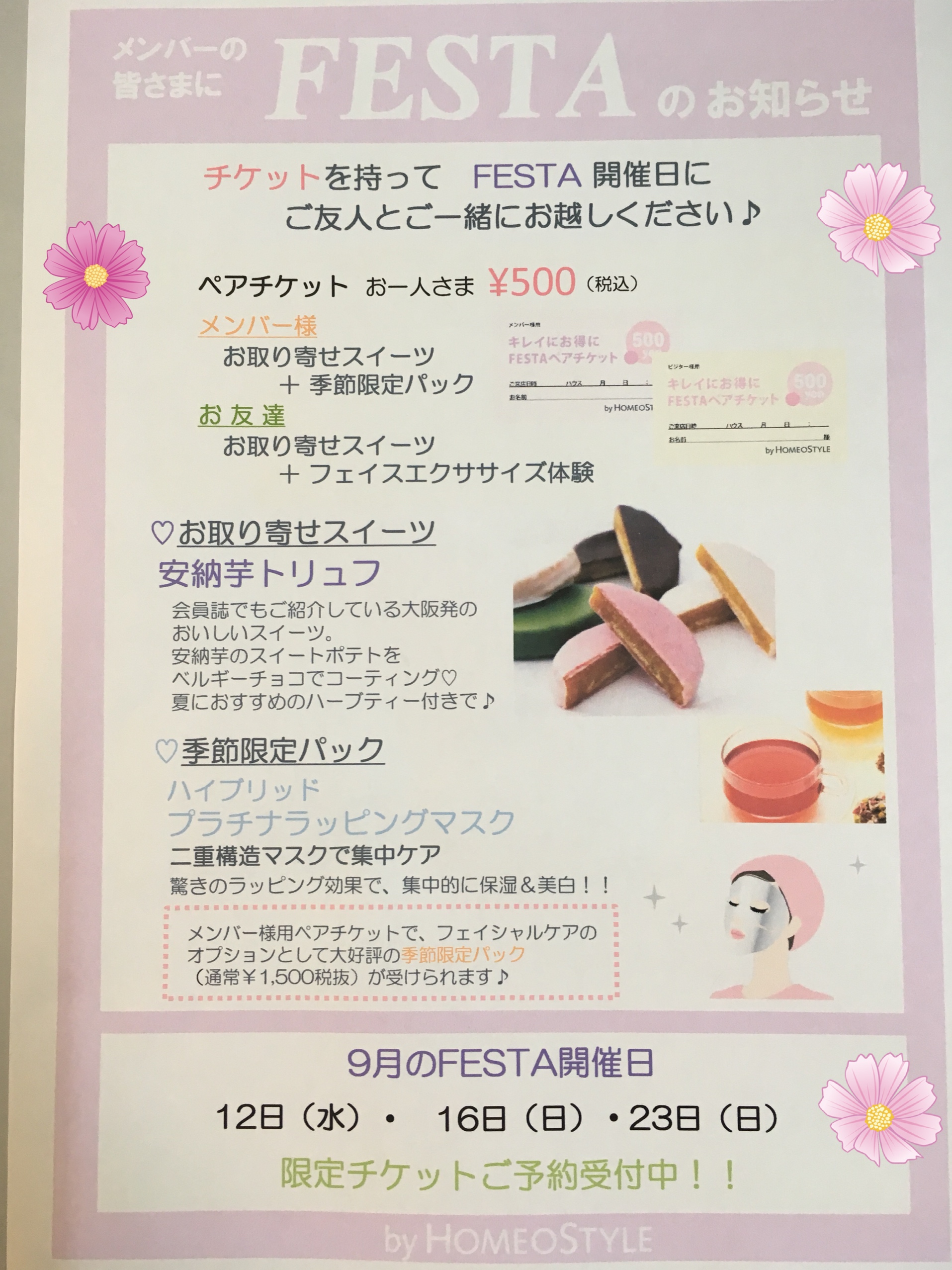 HOMEO BLOGホメオスタイルのブログ ハウスブログ 新宿 2018.8.23 新宿 9月のフェスタ💐 ホメオスタイル新宿の9月のフェスタは、 12日(水),16日(日),23日(日) お友達にも喜んでもらい、自分もハッピーに♡プラチナラッピングマスク♡しっとり美白効果高いです✨仕上がり大満足 そして、今回もスィーツは大好評の 安納芋トリュフ♡ ご予約はお早めに(^^) Share Post: カテゴリー コラム 一覧 計量スプーンも包丁もいらない♪ 超カンタン&おいしい元気回復系スムージー アリーのHOMEO LIFE~私のお腹の中を覗いてみる。~ 「夏のスキンケア」 カラダがほしがる水 大人の夏肌は(๑•̀ㅂ•́)و✧ 細胞力をUPしましょう☆彡 今年の夏旅におすすめ ハウスブログ 一覧 6月のスケジュールです✨️ eコンクファンタスティック2023✨️ マルチオイル美容液💧 新城ハウスです🎏 5月のスケジュール🎏 米沢ハウス☘️5月スケジュール 下書き東北仙台伊達福島山形米沢関東横浜銀座新宿土浦大宮東海浜松浜北豊橋新城田原湖西名古屋岡崎西尾吉良信越・北陸長野北長野千曲松本上田佐久中野上越あらい関西大阪京都奈良吉野中国倉敷岡山福山 最近の投稿 6月のスケジュールです✨️ 2023.5.31 eコンクファンタスティック2023✨️ 2023.5.18 マルチオイル美容液💧 2023.5.8 新城ハウスです🎏 2023.5.7 5月のスケジュール🎏 2023.5.2 人気の投稿 <地域限定コラボ> 地域の皆様だけのお得な話♪【 Vol.8仙台 】 20 views 雪の種類と名前 15 views #ぴよりんチャレンジ☆ 13 views 洋服の歴史 13 views ☆山梨銘菓 かねたまる餅☆ 11 views ヨガ 11 views 恒例の。。。 10 views ハンドベル部クイズ!当選者発表☆ 9 views 三時草 9 views AGEs 糖化度チェック 8 views アーカイブ 2023 6月のスケジュールです✨️ eコンクファンタスティック2023✨️ マルチオイル美容液💧 新城ハウスです🎏 5月のスケジュール🎏 2022 皆様をお出迎え(^^♪ 今年もありがとうございました。 1月のスケジュール🎍 1月のスケジュール 佐久1月 スケジュ-ル 2021 2021年ありがとうございました ありがとうございました✨ 本年もありがとうございました🍀 年末好例!!お餅つき 大阪ハウスより感謝の気持ちを込めて・・・💛 2020 2020年もありがとうございました☆ 2021年もよろしくお願い致します🐄 予告!21年2月に腸内フローラチェックが受けられます。 嬉しいお声! ホメオスタイル大宮1月スケジュール 2019 1月のスケジュール 年末年始に菌活🎶 大晦日 ありがとうございました。 大晦日♪ 2018 2018年も、ありがとうございました。 奈良ハウスの門松 2018年ありがとうございました ~2019:1月スケジュール~ 1月スケジュール 2017 2017年良いお年を✨岡山ハウス ハーバリウム♪ 有馬温泉 冬の御堂筋 ありがとうございました😊❤ 2016 今年も一年ありがとうございました⭐️ 大晦日 長野ハウス★今年も一年ありがとうございました! 12月30日(金) 仙台ハウスより 美活のための年末大掃除