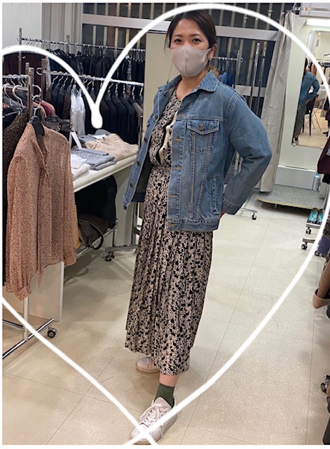 ジオメトリックプリントワンピースをデニムJKとスニーカーでオシャレにコーデイネートしているS様     いっつもセンス良く着こなしてステキっ スニーカーと合わせてもいいですよね~