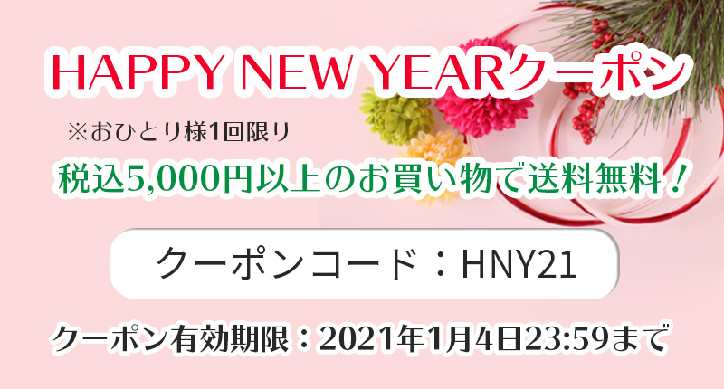 ご利用方法:ご購入手続き1ページ目のクーポン利用欄にクーポンコード【 HNY21 】を半角でご入力ください