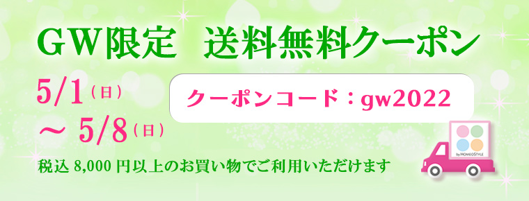 オンラインショップで税込8,000円以上ご注文の際にご購入ページのクーポンコード欄【クーポンコード:gw2022を入力すると送料無料になります。