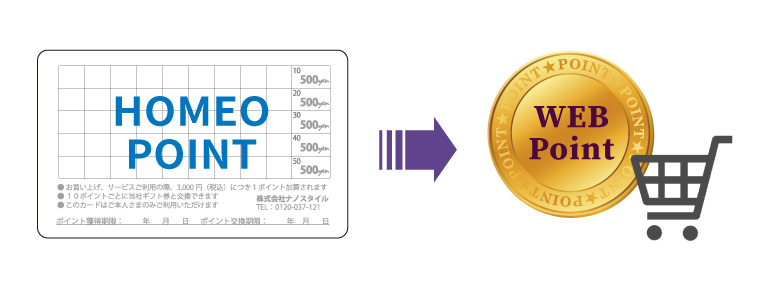 貯まったホメオポイントを「Webポイント」に交換すると、オンラインショップでもポイントを利用してお得にお買い物していただけます。ポイント交換は事前のお申込みが必要です。