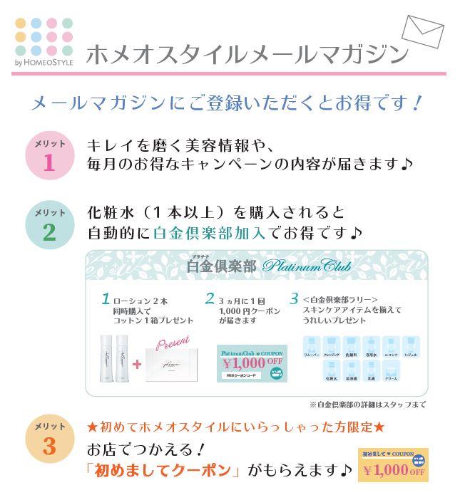 INFORMATIONお知らせ ホメオスタイル メールマガジン登録 2020.8.12 ホメオスタイルのメールマガジンに登録したらお得がいっぱいです♪ ↓↓↓↓↓↓ こちらから♪ カテゴリー お知らせ 会員特典変更のお知らせ/7月~9月獲得分のホメオポイントについて ホメオアプリ ホメオスタイル公式アプリ 商品 [10月1日新発売]新ブランド「pl é verre(プレヴェール)」~サプリとコスメで究極の素肌へ 重要 新制度「会員ステージ」がスタートしました ・・・ メルマガ登録 アーカイブ 2026 2月のNEWS 2月のハウス 2月のオンラインショップ 1月のNEWS 1月のハウス 2025 12月のNEWS 12月のハウス 12月のオンラインショップ 11月のNEWS 11月のハウス 2024 12月のNEWS 12月のハウス 12月のオンライショップ 11月のNEWS 11月のハウス 2023 12月のNEWS 12月のハウス 12月のオンラインショップ 11月のNEWS 11月のハウス 2022 12月のNEWS 12月のハウス 12月のオンラインショップ 価格改定のお知らせ 新生銀行キャンペーン 2021 12月のNEWS 12月のハウス 12月のオンラインショップ 11月のNEWS 11月のハウス 2020 12月のNEWS 12月のハウス 12月オンラインショップ 11月のNEWS 11月のハウス 2019 ☆全国の店舗 ☆フェイシャルケア ☆FEXA´-uni- のヒミツ welcom to HOMEOSTYLE♪ 12月のNEWS 2018 12月のNEWS 12月のハウス 12月のオンラインショップ 11月のNEWS 11月のハウス 2017 今月だけのプレミアム★ 12月のキャンペーン 12月のオンラインショップ プレヴェール★1周年記念 誕生!プレヴェールユー 2016 【イベント情報】体験イベント開催のお知らせ 年末年始休業/商品発送スケジュールのお知らせ 【オンラインショップ】メンテナンスのお知らせ [10月1日新発売]新ブランド「pl é verre(プレヴェール)」~サプリとコスメで究極の素肌へ [9月1日発売]「飲む」からはじめるスキンケア『プレヴェール プラセンタドリンク プララ』